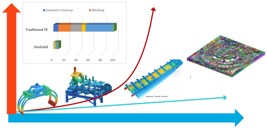 SimSolid独一无二的技术完全消除了几何简化和网格划分的任务,这是传统FEA分析中最耗时、专业性要求极高且极其容易出错的两项任务。使用SimSolid,可在几分钟内完成模型准备工作(类似于传统分析方法中的网格前处理)。